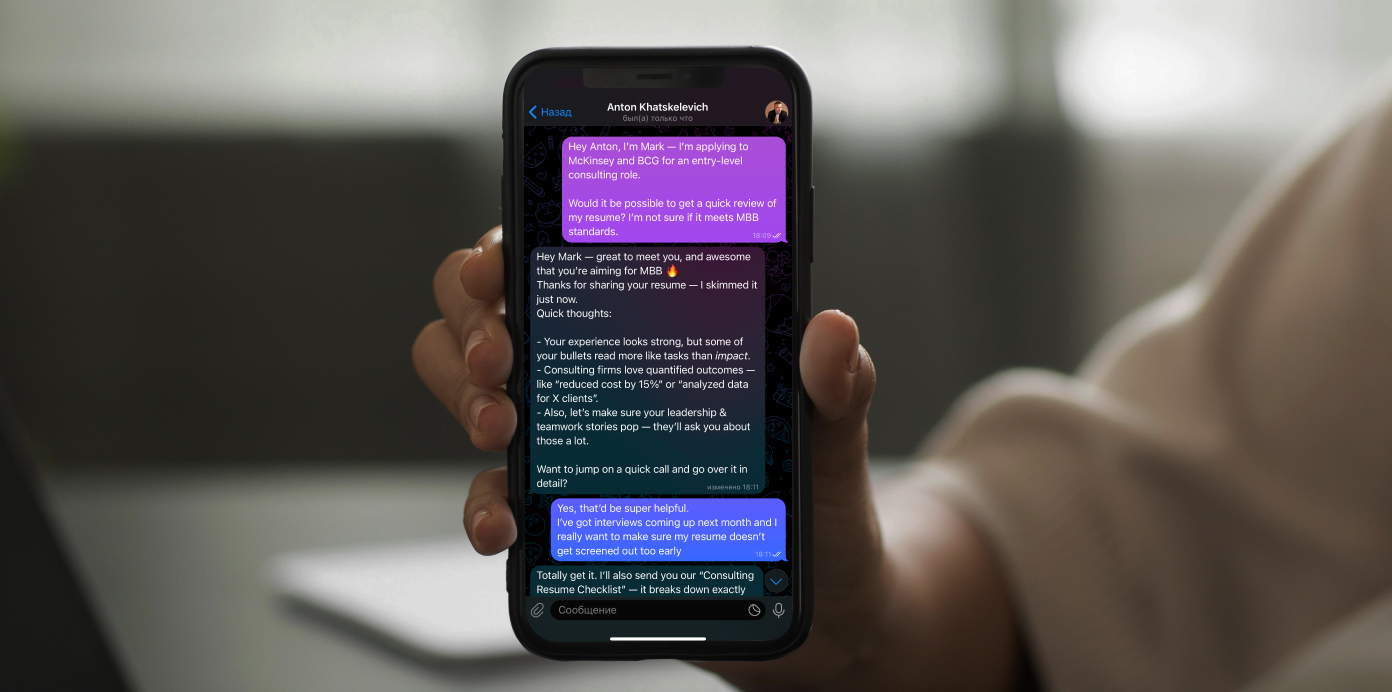 As a result of very detailed preparation and high-quality, hands-on feedback from the team led by Anton Khatskelevich, Veronica successfully secured an offer from a Big 3 consulting firm. She is now confidently building her consulting career and fully enjoying the path she worked hard to achieve.