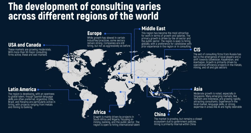 The consulting industry doesn’t grow uniformly—each region has its own pace, focus sectors, and hiring practices. Understanding these differences can give candidates a strong edge.