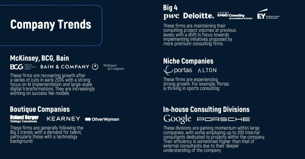 This group includes firms like Oliver Wyman, Roland Berger, and Strategy&, which embody certain aspects from both MBB and Big Four. These companies target comfortable training, overseas operations, and projects that intertwine strategy and execution.