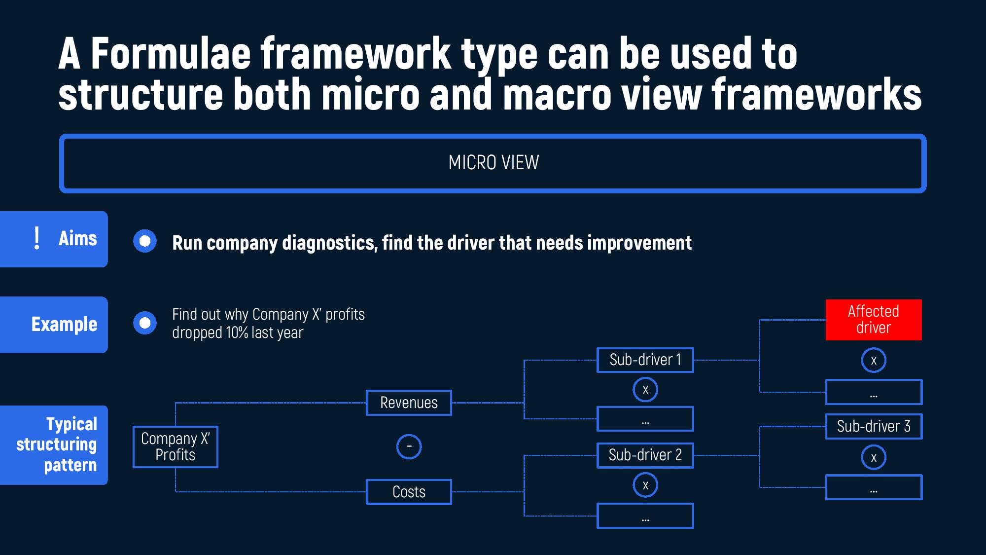 - Micro view focuses on profit-and-loss (PnL) related problems, such as breaking down revenues and costs into drivers.