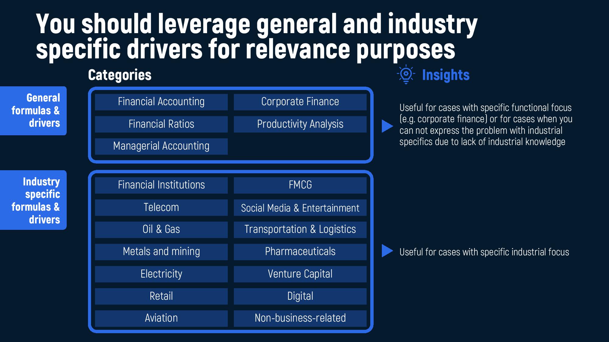 One of the biggest challenges in formula-based cases is knowing which drivers to use when you break down revenues and costs. A strong candidate doesn’t just rely on generic formulas — they adapt their framework to the specific industry context.