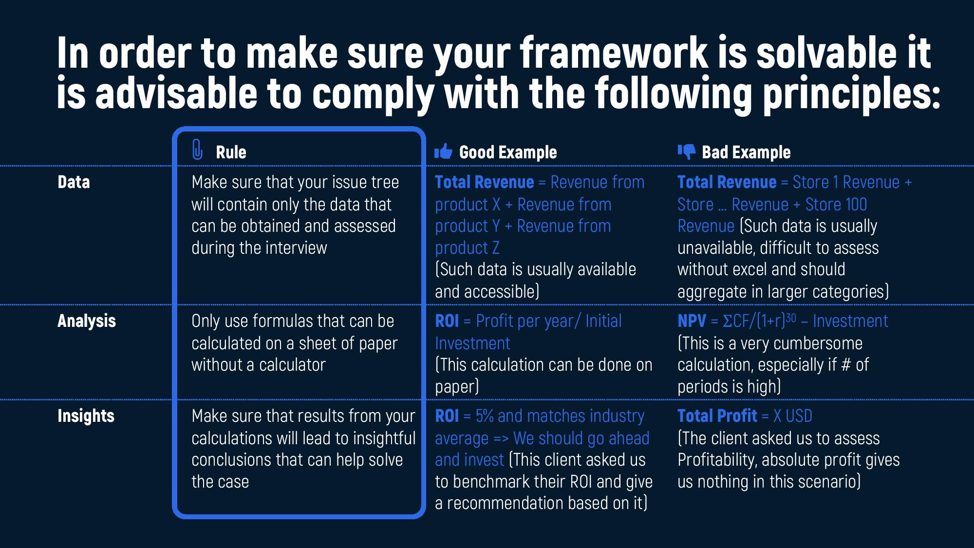One of the most common mistakes in formula-based cases is building a framework that looks logical on paper but cannot actually be solved during the interview. To avoid this, you need to apply the Solvability Principle: always ensure that your structure uses data that can be reasonably estimated and leads to meaningful insights.