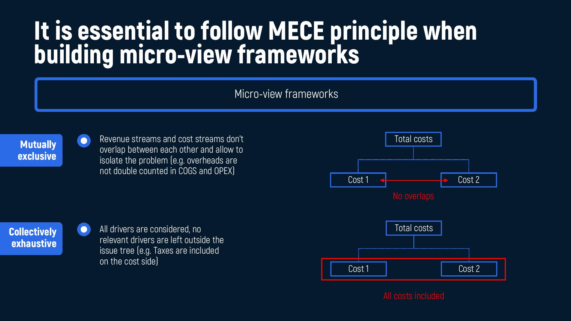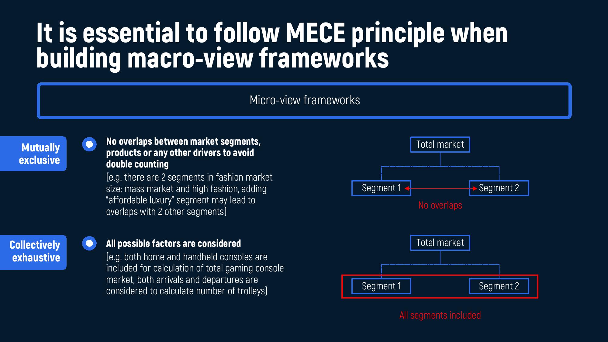- MECE: Ensure no overlaps and no missing segments in your framework.