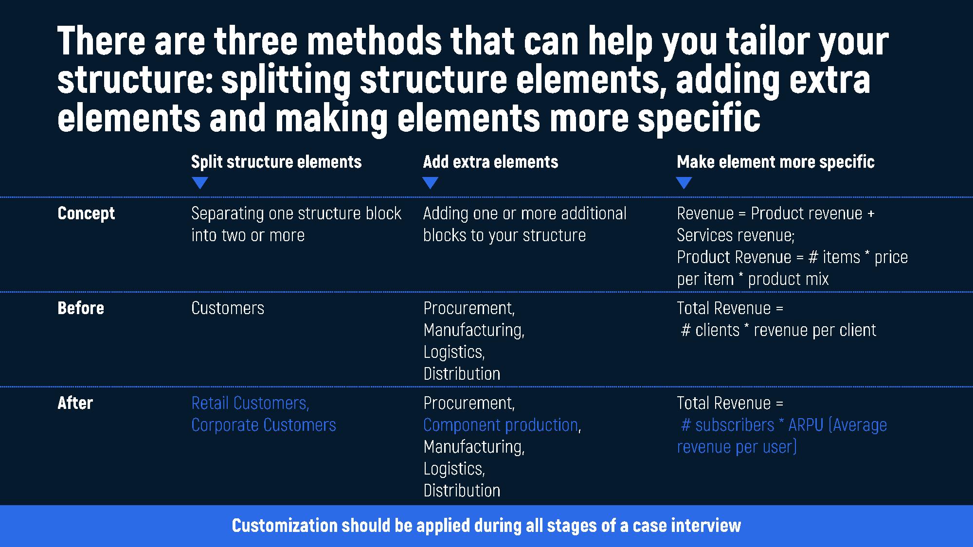 Even the best-known case interview frameworks are only starting points. To truly impress interviewers, you must show that you can adapt and refine them based on the situation. There are three powerful methods for doing this: splitting, adding, and specifying.