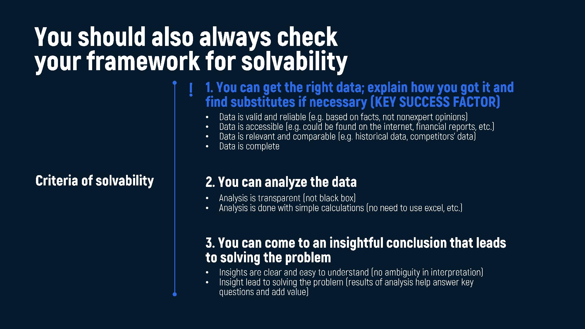 Finally, your framework should lead you toward business conclusions that solve the client’s problem. If your structure produces only numbers but no insight, it fails the solvability test.