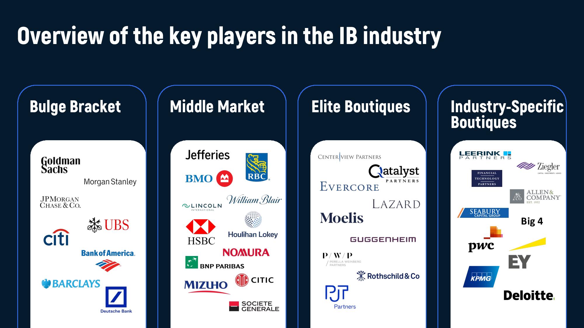 Investment banking is made up of a diverse set of institutions that differ in size, market focus, deal types, and client base. Understanding these categories is essential for candidates deciding where they might fit best.