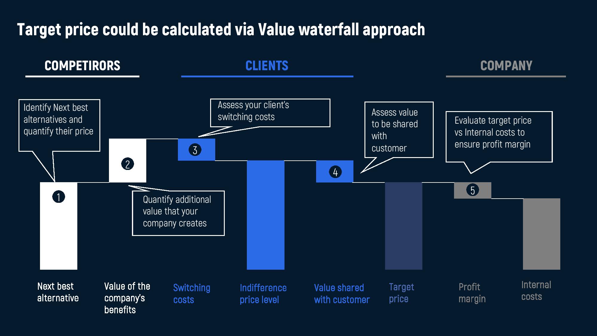 Once the three pillars are clear, the next step is to calculate the target price. One of the most useful frameworks for this is the Value Waterfall, which ensures that every step in the pricing process is logical and grounded.