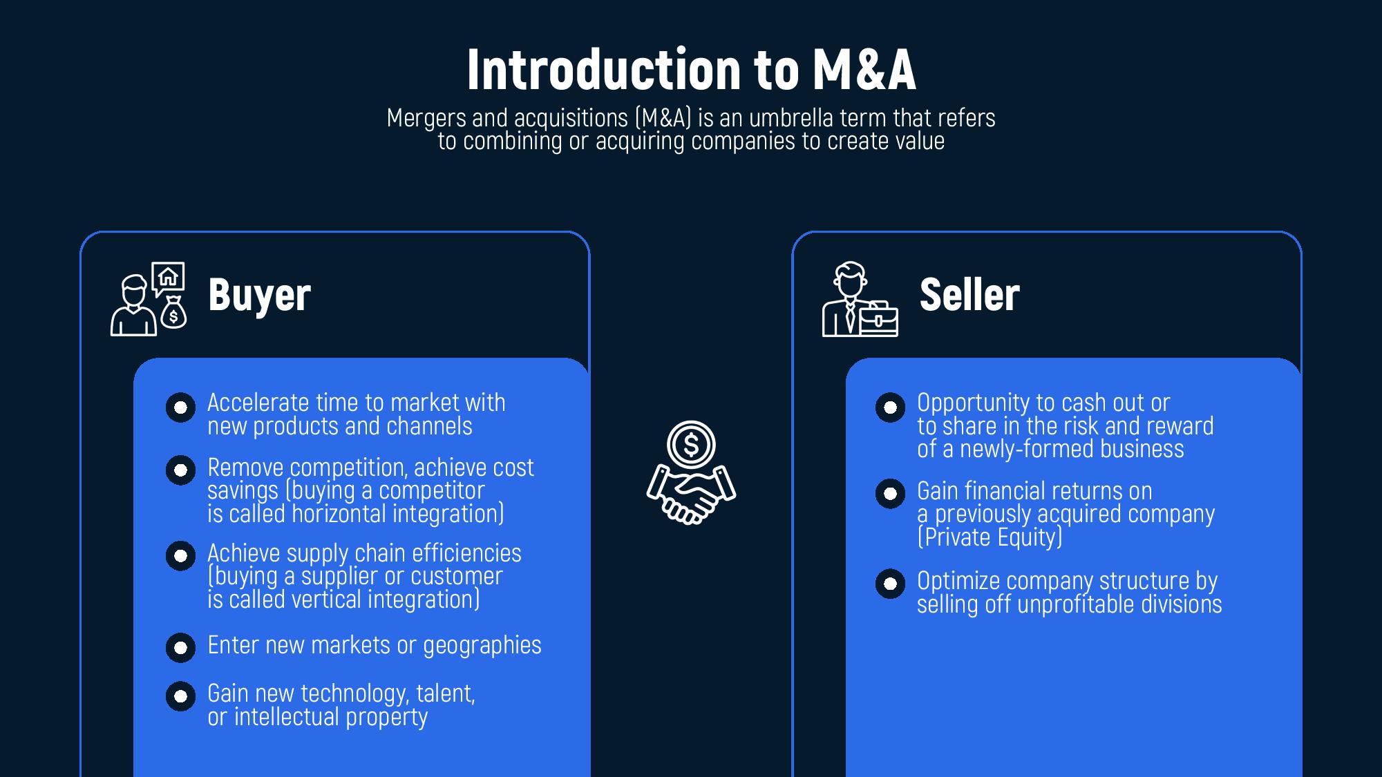 Be ready to define M&A crisply, distinguish merger vs. acquisition, and give two or three value creation levers with a quick example each (e.g., “horizontal = remove competition; vertical = supply chain efficiency; capability = IP/talent”).