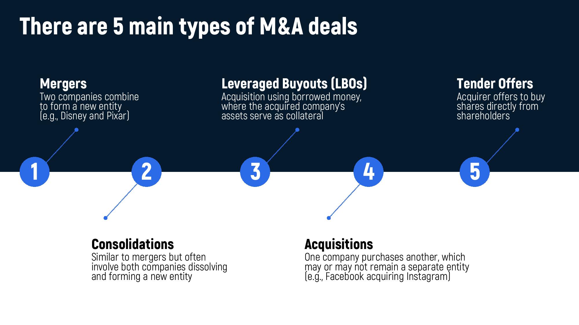 An acquisition happens when one company (the acquirer) buys another (the target), either through cash, stock, or a mix. These are the most common form of M&A.