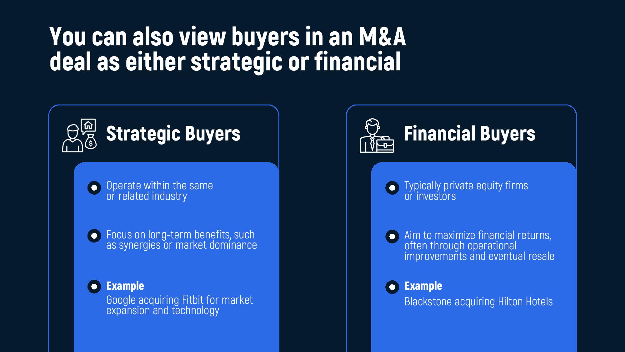 In M&A, it’s crucial to distinguish between strategic buyers and financial buyers. Both have different goals, approaches, and implications for valuation and deal structure.