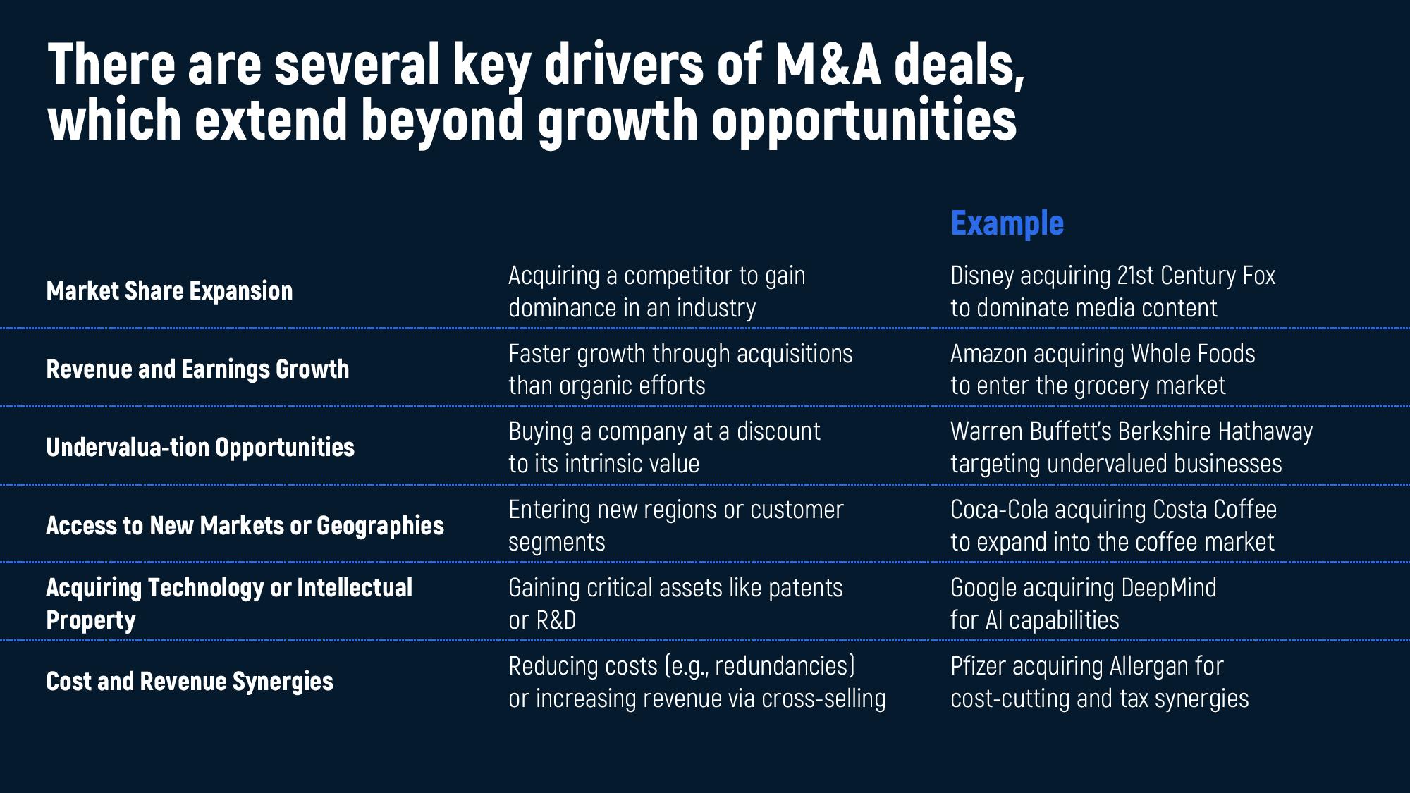 Behind every transaction lies a strategic or financial rationale. Understanding why companies pursue M&A is crucial, because it determines valuation, deal structure, and integration priorities.