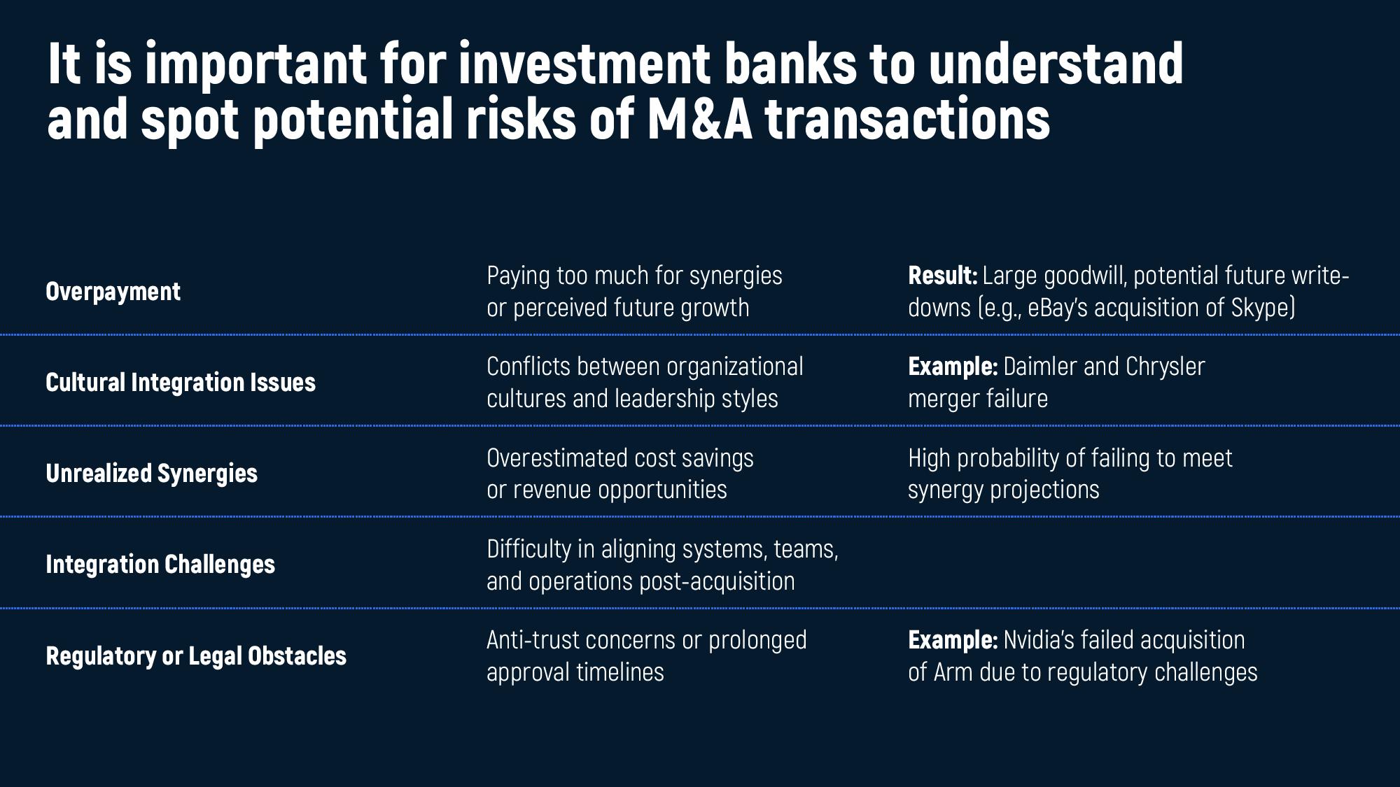 While M&A can unlock growth and value, it also carries significant risks. Many high-profile deals fail to deliver the expected returns, often due to overoptimism or poor execution. For bankers, recognizing these risks is key when advising clients; for candidates, being able to discuss them shows maturity and realism.