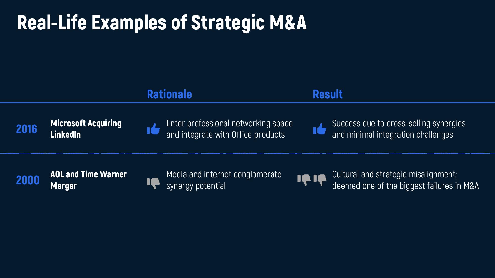 A strong answer highlights strategic rationale + synergies, then gives a real-world example.